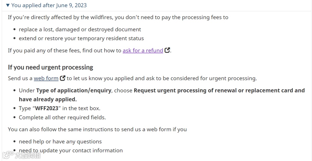 在5月6日至6月9日之间申请的,直接受野火影响的,可能有资格获得退款,具体取决于申请的项目,居住的省份等。如果申请护照或旅行文件,公民身份证明,永居卡的可以要求退款,但是申请临时居民文件(包括学签、工签),恢复或延长临时身份的不符合退款资格。