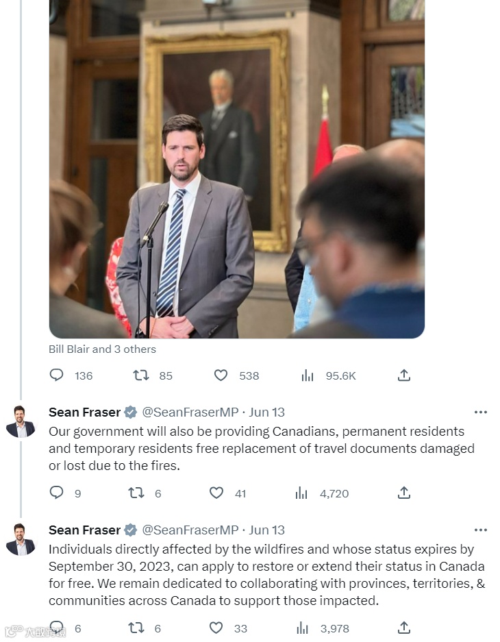 加拿大移民部长Sean Fraser周二在推特上称:加拿大政府将为直接受野火影响的加拿大人,永居居民,临时居民免费更换丢失的或损坏的旅行文件。受野火直接影响的,身份在2023年9月30日到期的人可以免费申请恢复身份或延期。移民部将致力于和各省、各地区、各社区协作,帮助那些受影响的人。