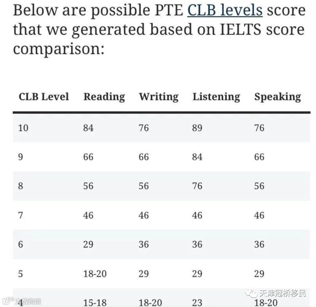 对于雅思CLB9相当于(听力8分,阅读7分,写作7分,口语7分),PTE等效分数在听力中为84分,其余能力为66分。