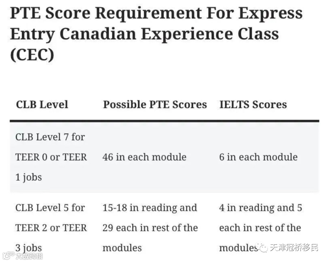 EE 快速通道项目下的加拿大经验类移民(CEC)的PTE分数要求: