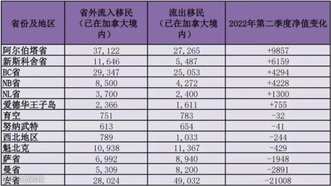 根据加拿大统计局数据显示,2021年-2022年之间,阿省从其他省份,特别是BC省和安省迁往那里的人数大量增加。其中2022年第二季度达到9,857人,第三季度增加了19,285人。