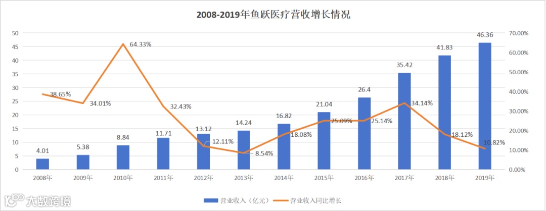 图:鱼跃医疗2008—2019年营收及增速,来源:锦缎研究院