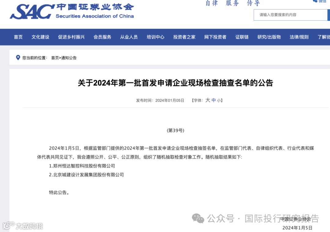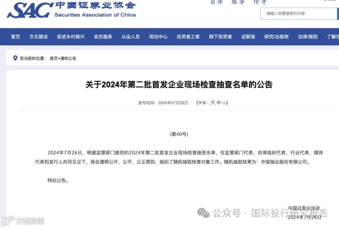 IPO考核失灵:2024年第二批首发企业现场检查抽查名单抽到中国铀业 第一批二家已全军覆没,中信证券成为“827新政”以来撤否率最高的公司但指标已失效