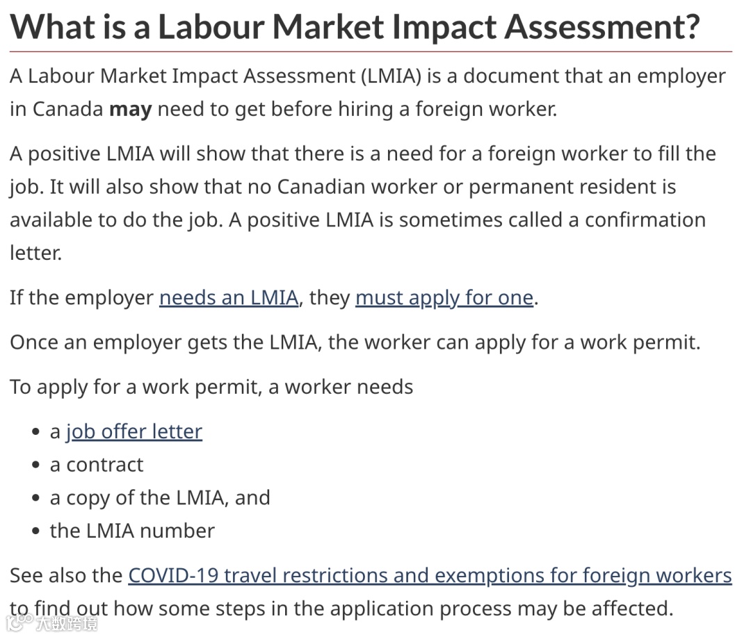 劳动力市场影响评估(LMIA)是由加拿大就业与社会发展部门(ESDC)作出的评估报告,用以判断用人企业是否有雇佣外国工人的需要。