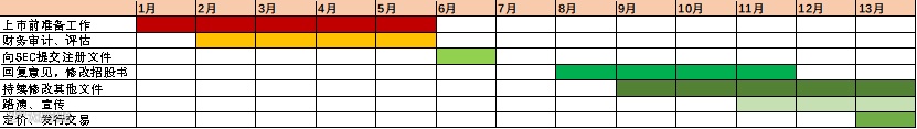 纵观三者的共通点,最典型的特征便是省去了中介流程,从而加快了上市节奏。根据迅实国际资料显示,以纳斯达克IPO上市时间表显示整个融资流程(从准备到上市)的周期大约在1年以上。