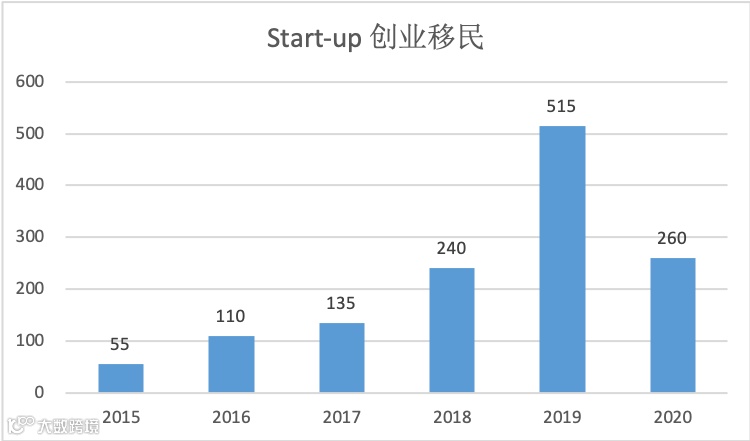 下表同样是在创业移民种类下发放的所有移民签证,创业类移民除了要计算家庭数量外,每个申请可以有5个合伙人做共同主申,而每个主申都有各自家庭,除以的系数还要增大。