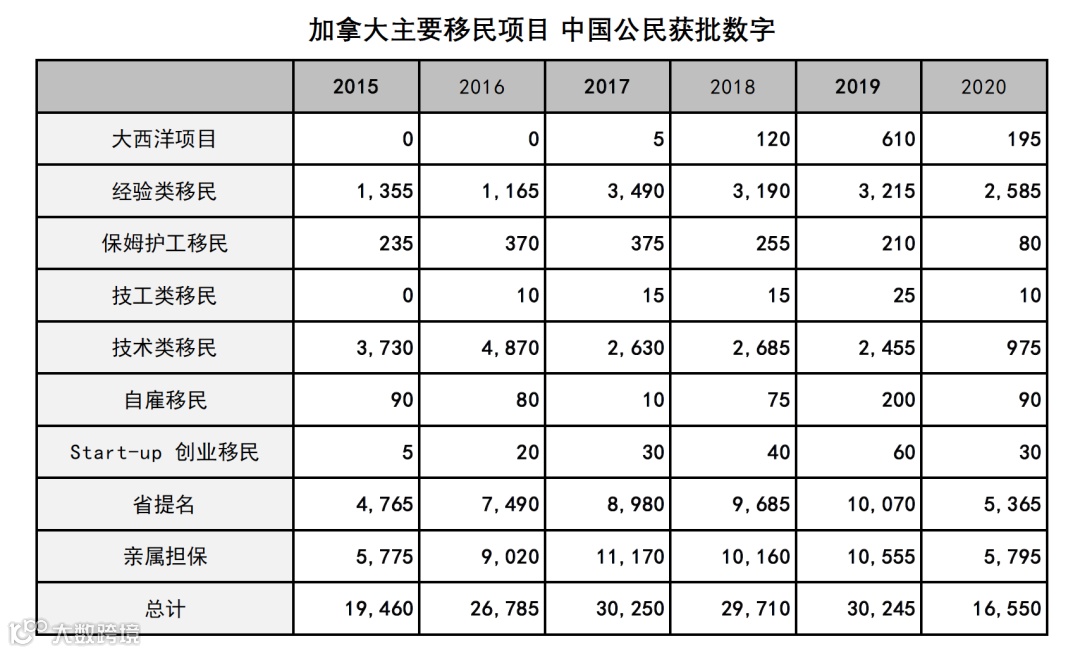最后,中国公民取得加拿大永久居民的各项目分类数据。其中少量企业家移民不做分类统计。