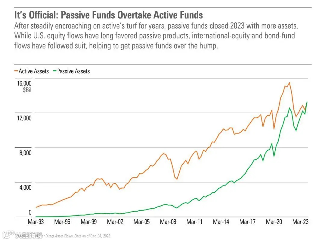 以全球共同基金规模第一的美国来说,截至2023年底,美股被动基金规模超越美国主动基金。
