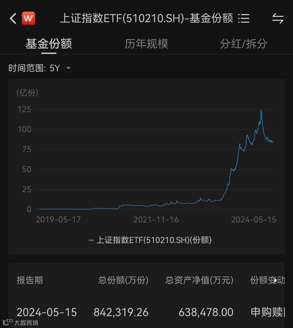 而基金的份额也是一路上升,一年多时间,从2022年底的10.63亿份,飙升到最近的84亿份,规模增加690%以上,1月底更是一度接近125亿份(当时上证指数2788点附近),显示出上证指数ETF的投资工具作用越来越被市场所认识。