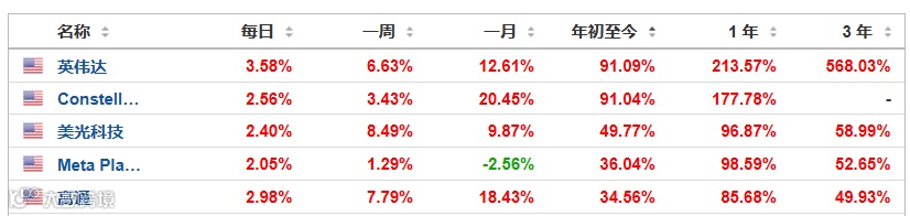 以纳斯达克100指数成分股来看,今年表现好的公司大部分是科技股,如英伟达、美光科技、META,英伟达今年上涨91.09%,近3年上涨568.03%。