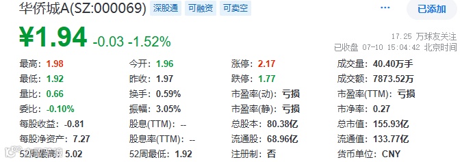 2024年7月10日收盘,华侨城A报收1.94元/每股,总市值仅剩155.93亿元。