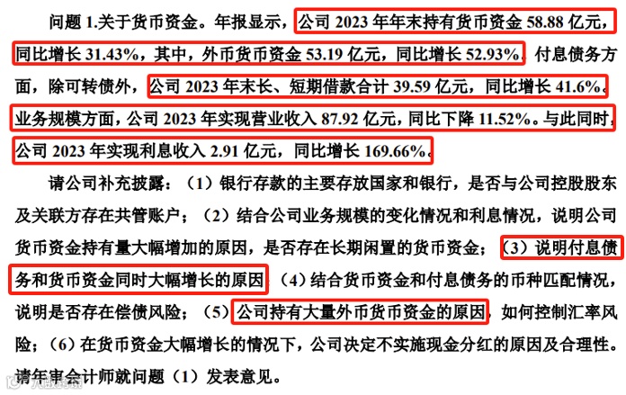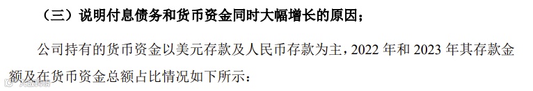 公司解释了付自债务和货币资金同时大幅增长(即高存高贷)的原因:2023年度与2022年度相比,公司付息债务呈现明显增长趋势,主要系满足公司日常经营流动资金需求。利率方面,公司付息债务平均利率呈现降低趋势,并明显低于同期美元存款平均利率。公司生产经营活动主要是人民币支付的支出为主,因此通过平均利率相对低的付息债务融资的方式以减少利息支出,同时将货币资金中的美元资金进行利率相对高的存款以获得利息收入,增加公司净收益。