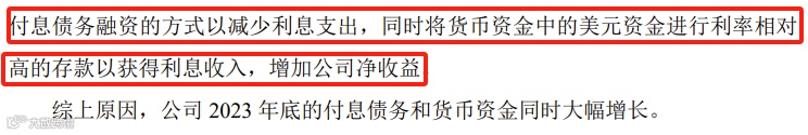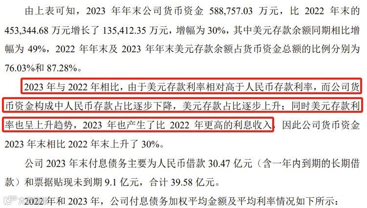 总结起来就是:公司大额使用低利率的人民币贷款用于生产经营支出,将出口取得的美元存在银行收取高利率的利息,由于人民币贷款利率低于美元存款利率,因此,公司2023年取得了2.91亿元的利息收入。这个财技术确实是高。