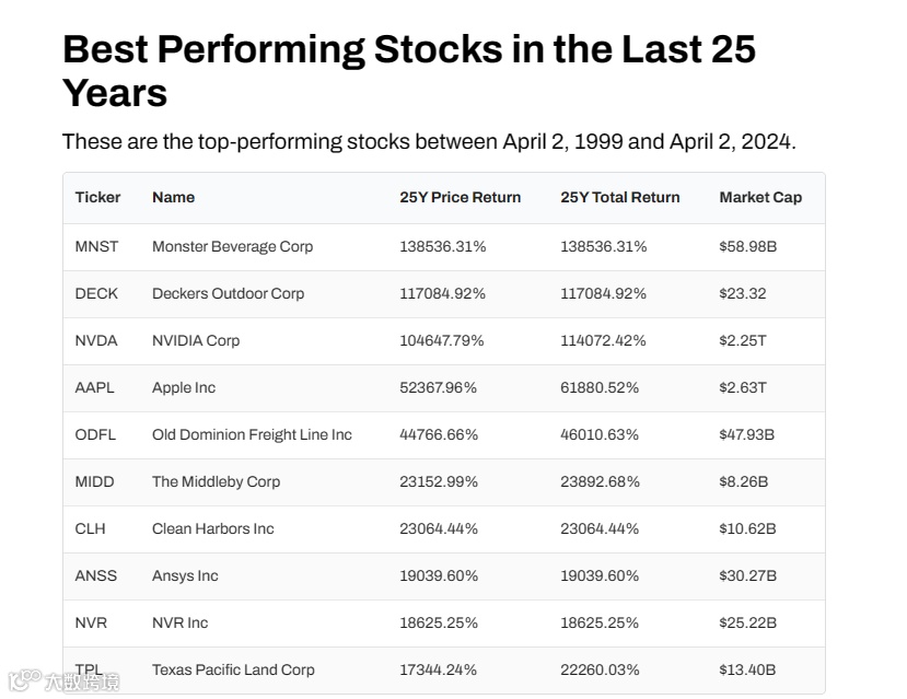如看到美股过去10-25年里表现最优秀的股票表现。