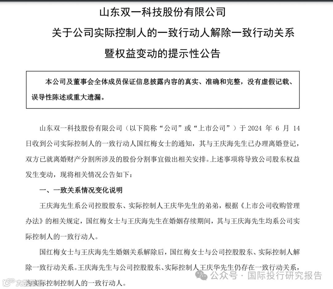 山东双一科技昨天公告,一致行动人股东国红梅已经和控制人第一大股东的弟弟离婚,本来,离婚套现离婚减持已经是A股套路,证监会对离婚套现做了各种规定,但是这个离婚确实有点奇怪。看了一下证监会离婚减持固定,似乎都是为大股东和一致行动人准备的,所以国红梅如果这样套现成功,可能引起更多公司小股东创始人效仿,一致行动人小股东离婚或成A股新景观。