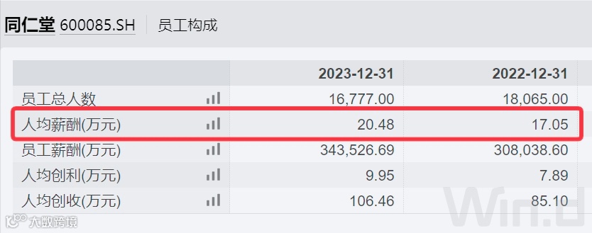 2023年,同仁堂人均创利约10万元,比2022年增加2万元,人均薪酬20.5万元,比2022年增加3万元。