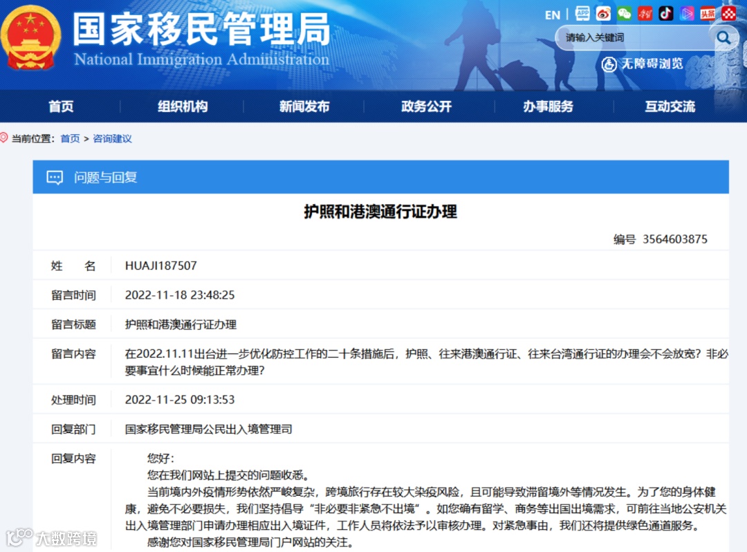 中国国家移民管理局:这些事属于必要出境