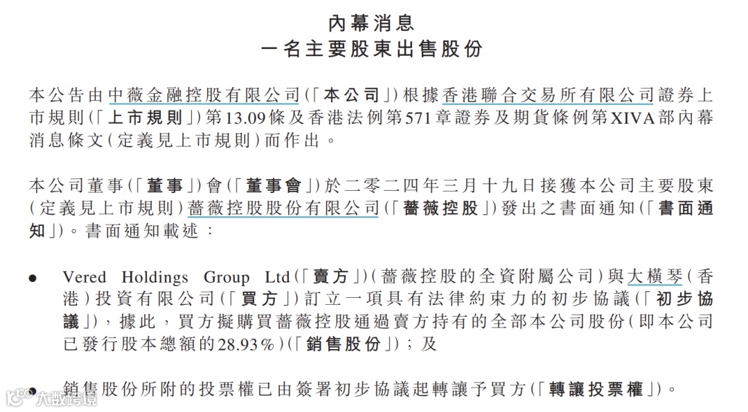 大横琴集团有限公司(简称大横琴集团)于今年3月15日签订协议,蔷薇控股计划悉数出售手上100.43亿股或28.93%中薇金融给大横琴集团,每股作价0.0896港元,涉资8.99亿港元,同时将上述股份所附的所有投票权 、权利、权益转让给大横琴集团。
