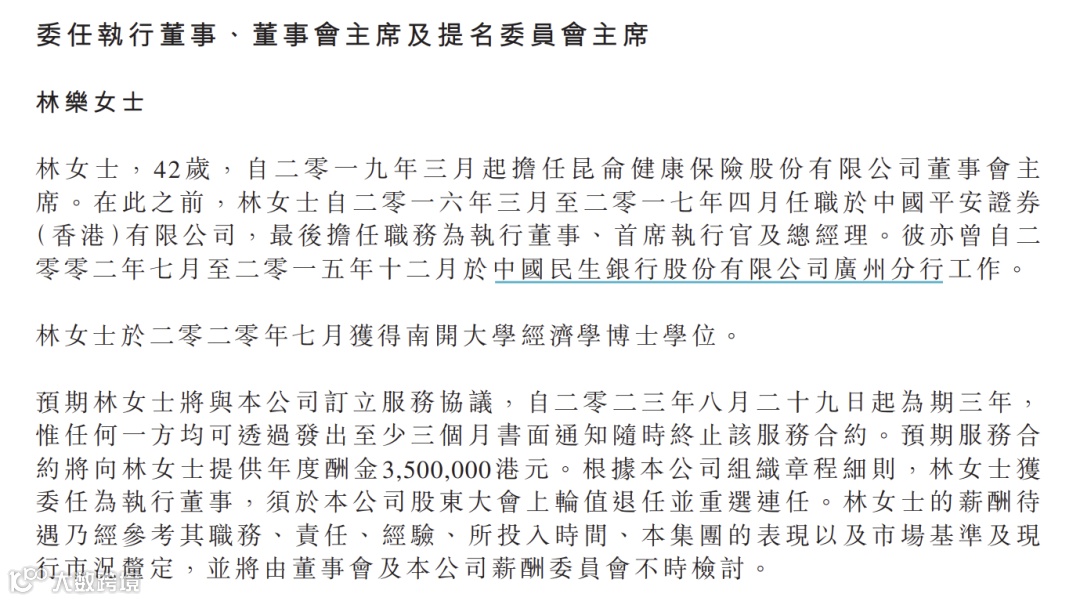 中薇金融2023年8月29日发布公告,委任林乐担任公司执行董事、董事会主席及提名委员会主席,年度酬金为350万港元,服务协议为期三年。