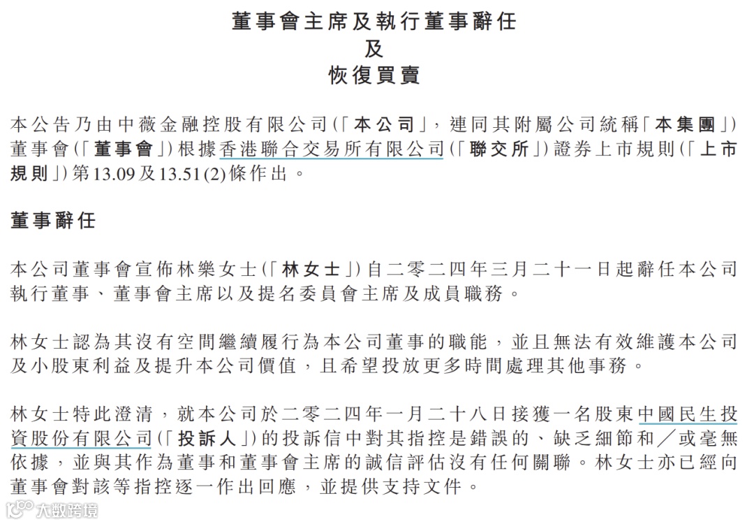 3月21日,中薇金融停牌并发布公告称,林乐自当日起辞任公司执行董事、董事会主席以及提名委员会主席及成员职务。林乐认为其没有空间继续履行公司董事的职能,并且无法有效维护公司及小股东利益及提升公司价值,且希望投放更多时间处理其他事务。