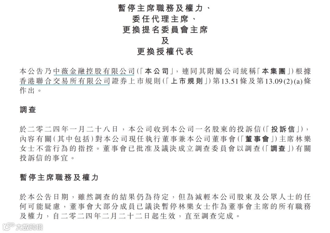 据中薇金融今年2月23日发布的公告,2024年1月28日,公司收到一名股东的投诉信,内容涉及对时任执行董事兼董事会主席林乐不当行为的指控。董事会批准及议决成立调查委员会以调查有关投诉信事宜。同时,董事会大部分成员已议决暂停林乐的董事会主席职务,直至调查完成。