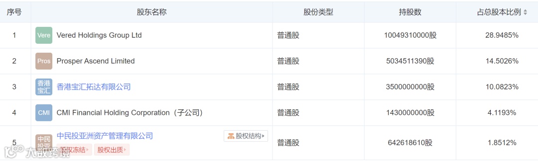 目前,中薇金融第一大股东仍是Vered Holdings Group Ltd;第四和第五大股东CMI Financial Holding Corporation和中民投亚洲资产管理有限公司,均为中民投全资子公司。