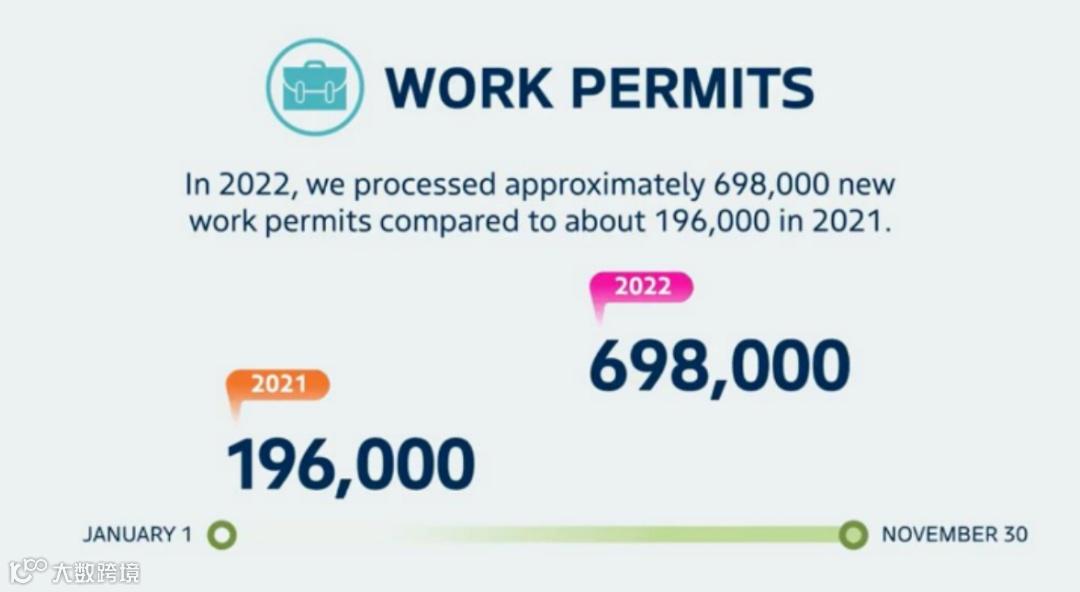 工作许可的审理也有了巨大的改善,截至 11 月 30 日,已审理了近 70 万份工作许可,而在 2019 年的同一时期,在疫情大流行之前,大约有 22.3 万份。