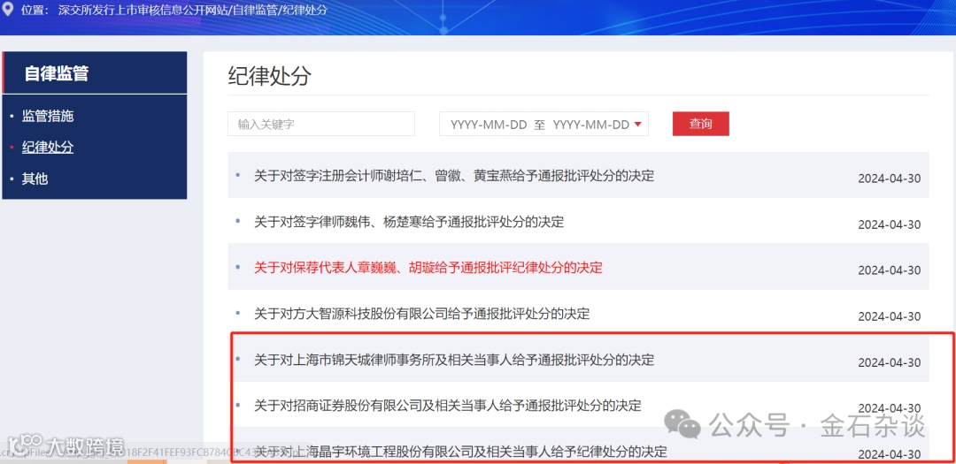 根据纪律处分,深交所对晶宇环境禁业三年,对实控人肖龙博、陆魁等公开谴责;对招商证券以及保代王志伟、尹涛给予处分,并记入诚信档案;对锦天城及签字律师李明文、张光辉、张艺馨给予处分,并记入诚信档案。