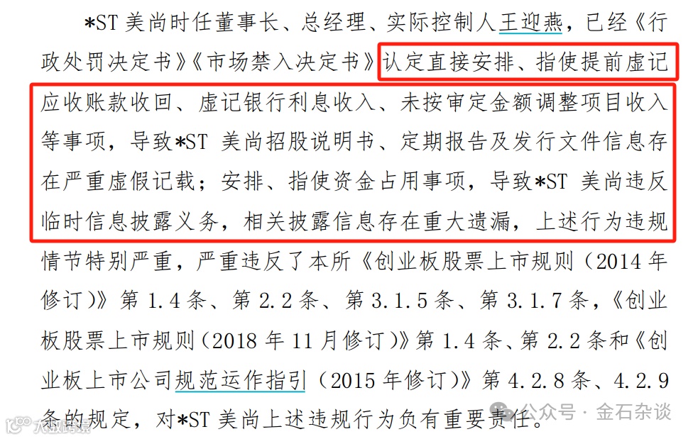 在证监会对ST美尚进行纪律处分决定中,ST美尚女掌门王迎燕确实承认了违规事项,直接安排、指使提前虚记应收账款收回等事项,导致招股书存在严重虚假记载;安排、指使占用资金,导致ST美尚违法披露,违规情节严重。