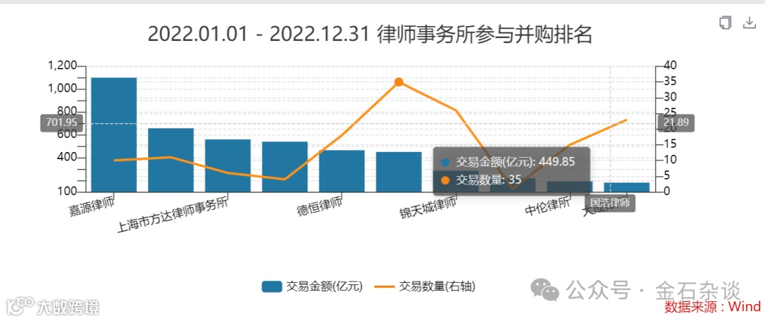 根据wind数据,按交易金额计,锦天城在2021年市场份额高达13.83%仅次于中伦的25.98%;不过,2022年市场份额骤降至4.49%,位列第七;2023年市场份额则只有1.49%了,可谓锐减惨烈。