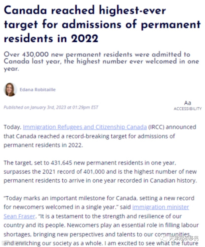 加拿大移民部长肖恩·弗雷泽(SeanFraser)在一份新闻稿中写道:“新移民在填补劳动力短缺、为我们的社区带来新的视角和人才以及丰富我们整个社会方面发挥着至关重要的作用。我很高兴看到未来情况,并期待着2023年迎来又一个历史性的一年,因为我们将继续欢迎新移民。”
