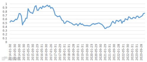 上一次小盘风格的最高点是在2016年10月的0.963,之后开始逆转,本轮小盘风格从21年1月开始,最高点是去年11月的0.741,目前回落到0.70的位置,没有达到上一轮最高点。