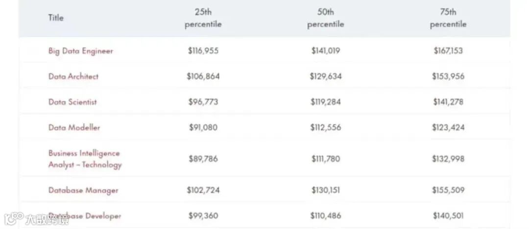 这张图列出了数据相关工作的一些平均工资。比如说,商务智能分析师的平均工资已经来到了$111,780;而数据科学家的平均公司达到了$119,284;大数据工程师的平均工资更是达到$141,019。
