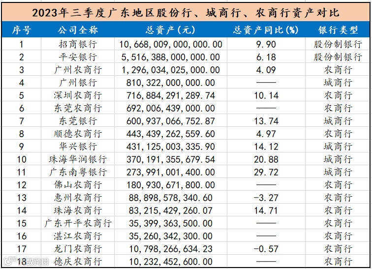 根据数据统计,截至2023年三季度,招商银行和平安银行分别以超十万亿元和五万亿元的资产规模分列冠亚军,其次便是广州农商行1.3万亿元和广州银行八千亿元,深圳农商行则在广东地区这三种类型银行中位列第五名。