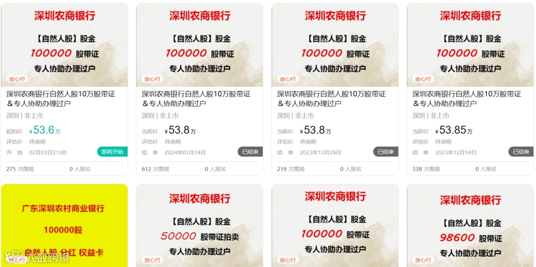 此前,深圳农商行的股份曾多次现身司法拍卖平台。2023年3月,一笔9.45万股的股权竞拍28次后,以36.70万元成交,折算每股价格为3.88元;2024年1月4日,一笔37.77万股股权拍卖,起拍价为181.30万元,相当于每股价格4.8元,不过因无人出价最终以流拍收场。