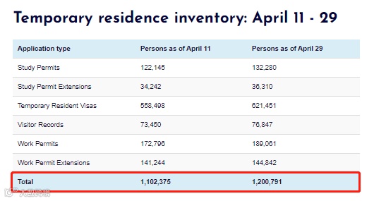 根据加拿大移民部公布的最新数据显示,截至到4月29日,IRCC签证库存总量已经达到了1,200,791份。