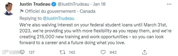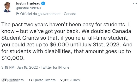 特鲁多在推文中表示,过去2年对于学生们来说实在是很不容易,加拿大联邦政府也将尽力支持大家,目前Canada Student Grants助学金金额已经翻倍!