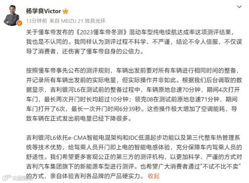 同日下午,吉利集团副总裁杨学良同样发文。“关于懂车帝发布的《2023懂车帝冬测》混动车型纯电续航达成率这项测评结果,我也是不认同的。我同样认为测评过程不科学、不严谨,结论不令人信服,不仅误导了消费者,还伤害了懂车帝自身的公信力。”