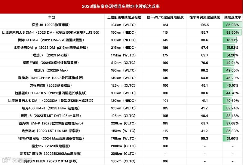 以比亚迪为例,其在插混车型的纯电续航达成率方面确有独到之处。此次测试榜单的前四名中,第一名仰望U8,标称纯电续航124千米,实际续航105千米,续航达成率为85.1%;第二名宋PLUS DM-i,标称纯电续航116千米,实际续航成绩95.7千米,续航达成率达到了82.5%;腾势D9拿下第三名,标称纯电续航145千米,实际测试续航为88.6千米。比亚迪唐DM-P标称续航189千米,实际续航是97.4千米,续航达成率51.53%。