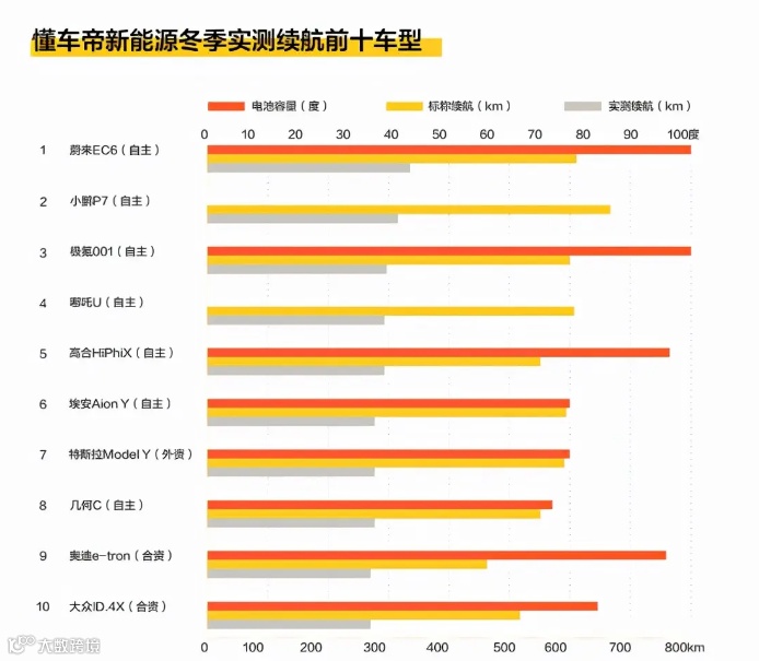 结果,不难想象。在懂车帝2022冬季测试中的低温续航测试环节中,大批纯电车型半路趴窝。此次参与测试的新能源汽车(包括增程、插混)的平均续航达成率——48.5%。