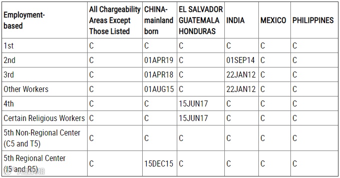 EB-5直投类别显示“C”,无排期;EB-5区域中心类别显示“U”,无签证名额可用。虽然EB-5区域中心计划得已再授权,但新法中区域中心计划的部分内容要在法案生效的60天后再生效,所以目前EB-5区域中心类别还是显示“U”。