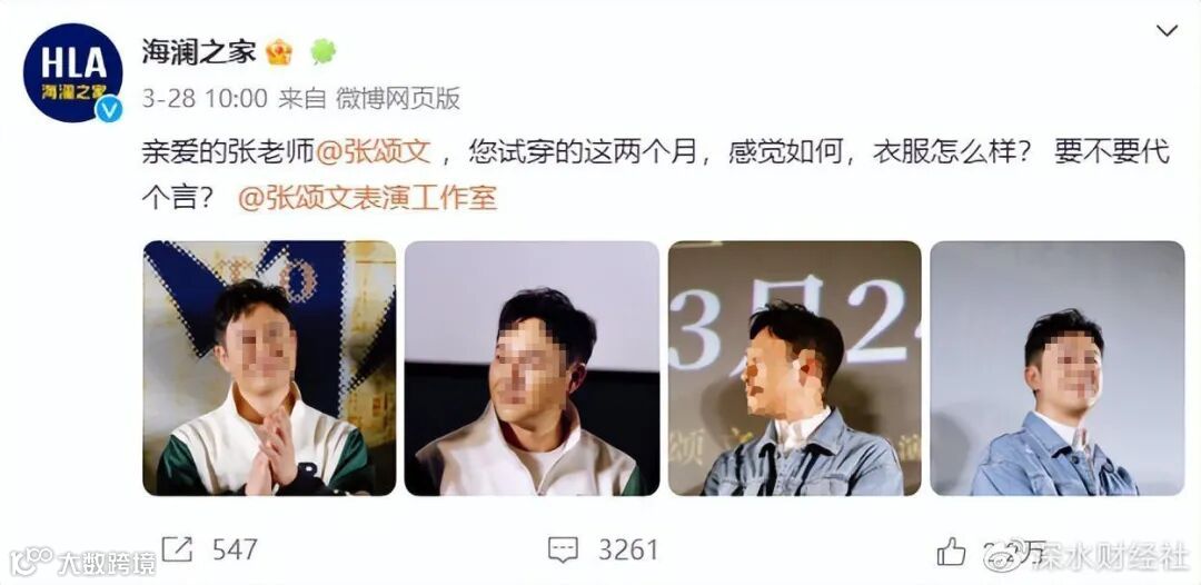 3月28日,海澜之家官方账号在网上喊话张颂文:亲爱的张老师,您试穿的这两个月,感觉如何,衣服怎么样?要不要代个言?