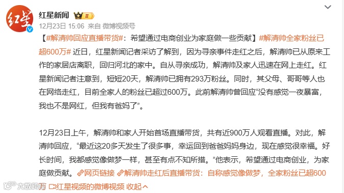 在回应直播带货时,解清帅说“现在我想尽我的绵薄之力,做一些有意义的事,希望更多的孩子回到父母身边。父母也很支持他直播带货,希望通过电商创业为家庭做一些贡献。”