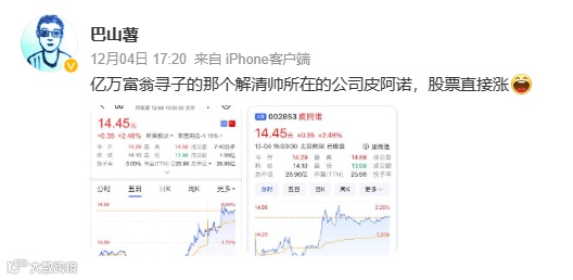 不止是因为解清帅一家有600万粉丝矩阵打底,还因为在解清帅寻亲成功的过程中带动了格灵深瞳和皮阿诺带涨两家A股上市公司的股价上涨,皮阿诺直播间更是人气暴涨数百倍。
