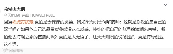 但对于解清帅而言,他口中的“靠自己电商创业”显然并不能成为说服大众接受他直播带货的体面理由。