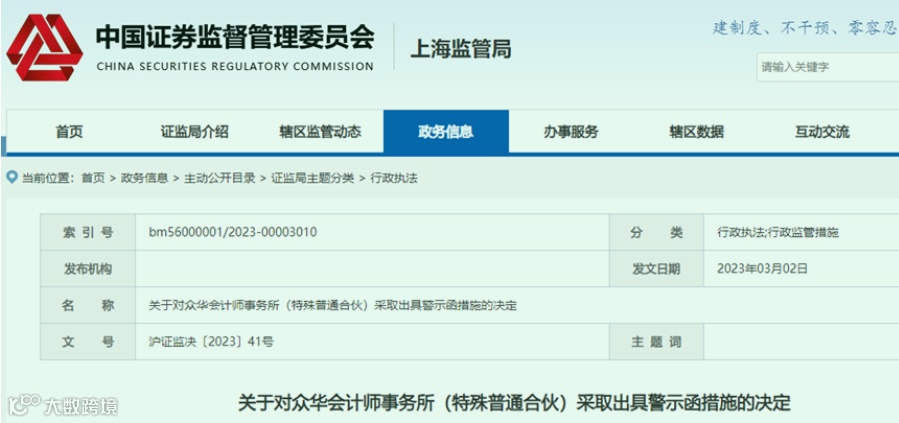 今年3月,因内部治理、质量控制和独立性方面以及执业项目存在问题,上海证监局向众华会计师事务所(特殊普通合伙)出具了警示函。