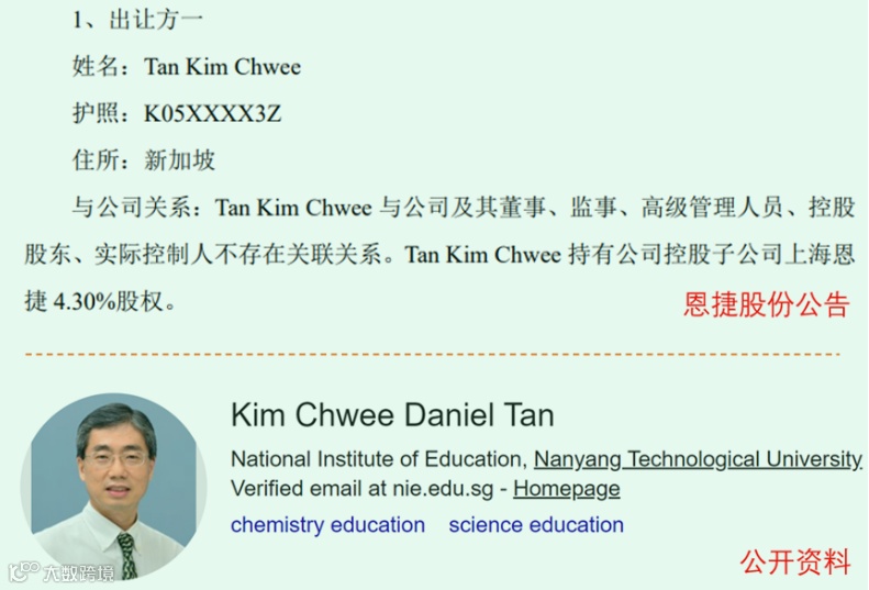 赶碳号特意查询了三年前被收购股权的Tan Kim Chwee,与之在名字上最匹配的是一位化学教授,目前在新加坡南洋理工大学国立教育学院自然科学与科学教育部任职的Tan Kim Chwee Daniel。