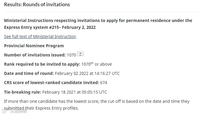 加拿大当地时间2022年2月2日,联邦快速移民通道Express Entry第215次邀请分数674,邀请1070人。此次抽选是针对已经获得省提名600分加分的申请人。