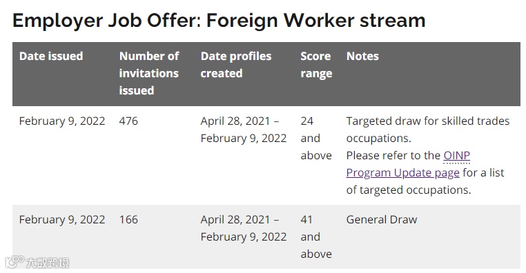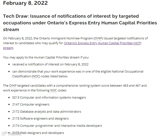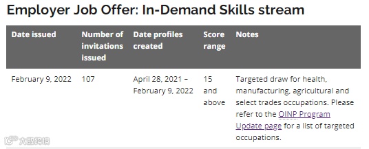 加拿大安省于2022年2月9日进行新一轮邀请: