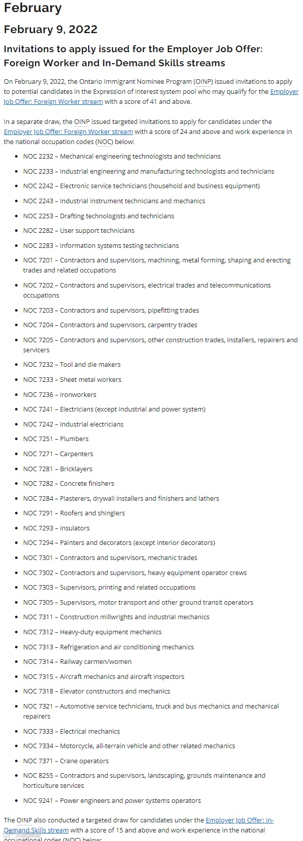 加拿大当地时间2022年2月8日, 安省移民局公布了最新一轮的快速通道优才类别 (EE-human capital priorities) 优先岗位抽签NOI邀请情况: